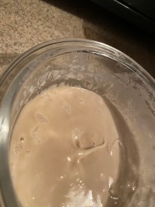 I checked my culture again. The smell was not as awful as the previous days! The top was not as dry as before, and there were gas bubbles present!! I then transferred a tea spoon of my bottom culture into a small clear bowl and added 2 tablespoons of my flour mix. I then added warm water and mixed mixed and mixed. I then covered it with a kitchen towel and placed it into a dark spot in the kitchen. I will be doing the same steps for the next 10 days!!