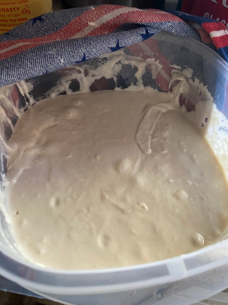I will be baking my sourdough bread tomorrow (Finally!!). But today I will be making my leaven. To make my leaven I will be transferring 1 tablespoon of my culture into a clear bowl. I added 1⅔ of cups of flower mix and and ½ plus ⅓ cup of water! I then mixed it with my bare hands. I then covered it with a kitchen towel and let it incubate for the night..
